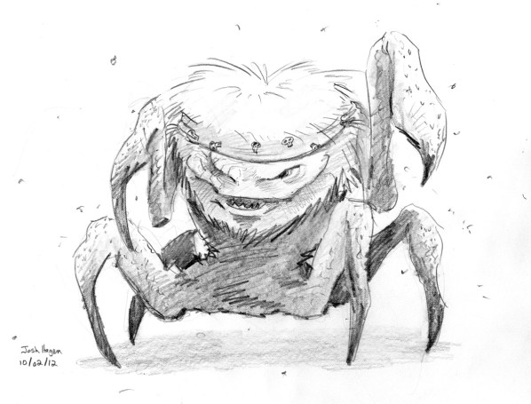With the second monster, I gave myself a 10 minute time limit. I started scribbling lines all over the place – had no plan of what it would be – and eventually started to see some shapes that I liked. I could see a nice big head and some pointy legs. From there it ended up a crab-man biker dude….or something.