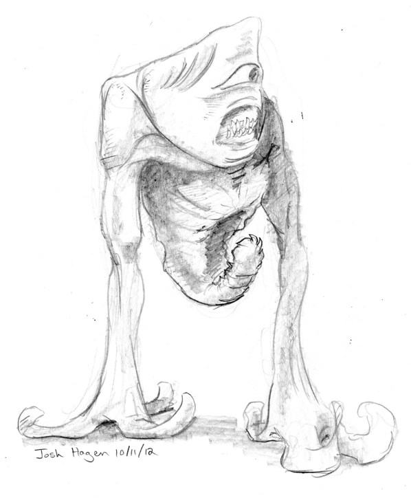 31 Days Of Monsters – Day 11 – It’s been a very busy day so far and I kept pushing my daily monster back. Finally put aside an illustration, got a piece of card stock and…well, stared at it. lol Had no idea what to do. So, I decided to pull out an old trick – I closed my eyes and sketched in some lines for a while until I felt like I had enough to start from. I opened my eyes and I had some lines for his arms/legs, the head and the underformed torso. I sketched him in and here he is – gave myself about 10 minutes start to finish.