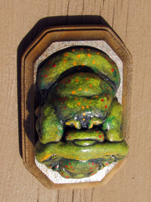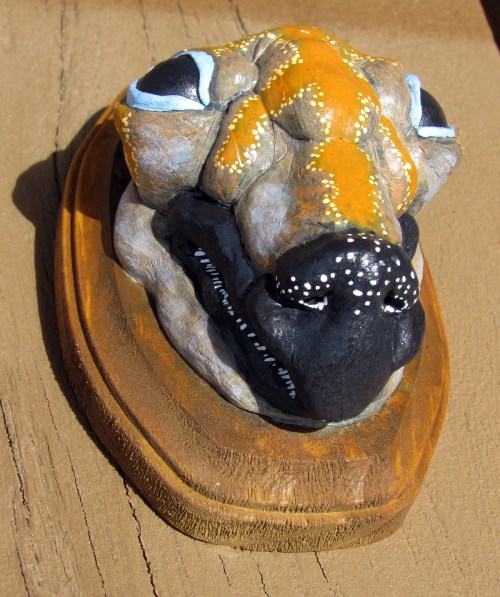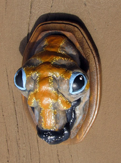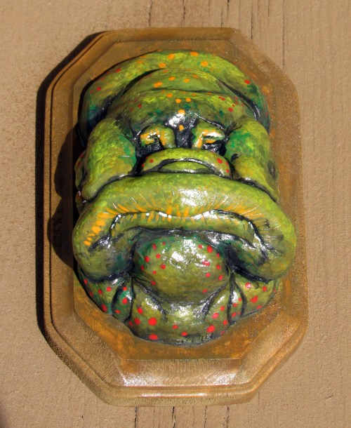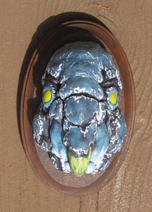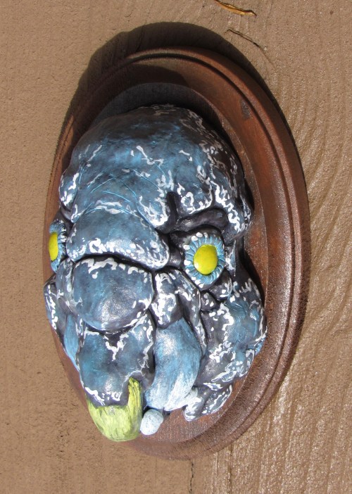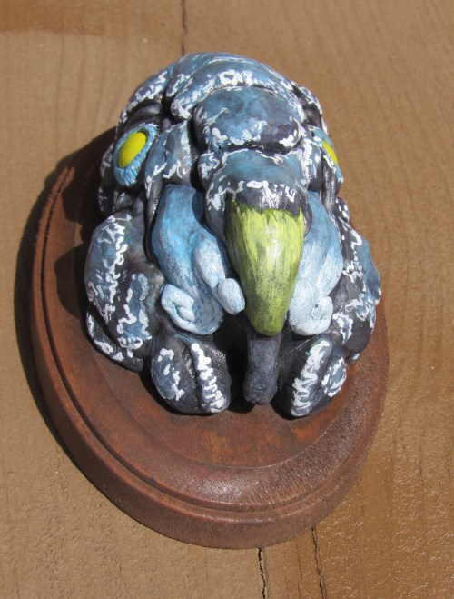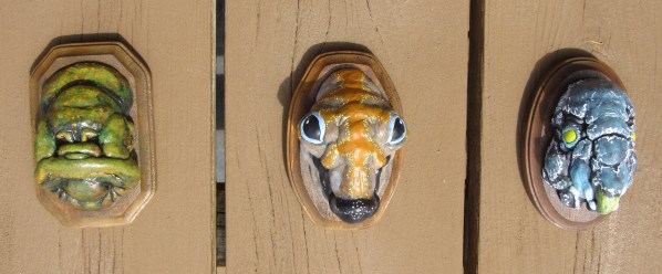 First off, here are my three gallery pieces. I had an odd idea of creating 3 “Strange Trophies.” Trophy heads of three strange creatures. All three were sculpted in a super sculpey / super sculpey medium 50/50 mix. They were then painted in acrylic and sprayed in a gloss finish.